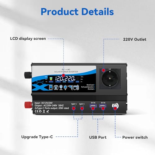 Dank der vielseitigen Anschlüsse mit 2 AC-Steckdosen, 2 USB-Anschlüssen, 2 Type-C-Ports und einem Zigarettenanzünder bietet dir dieser Wechselrichter 24V flexible Lademöglichkeiten für deine Geräte. Das integrierte LED-Display zeigt dir in Echtzeit wichtige Informationen wie Spannung und Leistung an, sodass du den Betrieb stets im Blick hast.