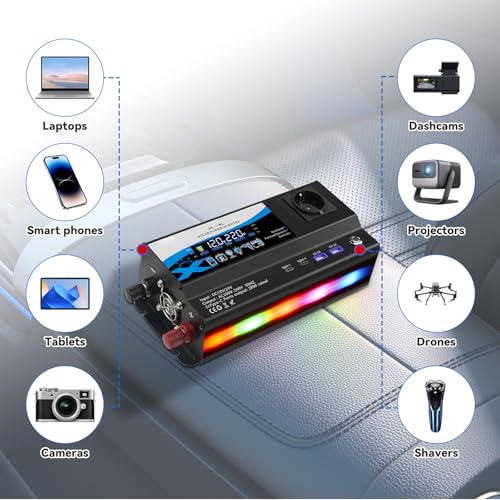 Fragen und Antworten zu 1200W Kfz Wechselrichter 12V/24V auf 230V, Wechselrichter mit Auto Spannungswandler mit 2 AC Steckdosen, 2X USB & 2X Type-C, Zigarettenanzünder & LED Display für LKW Wohnmobil Camping