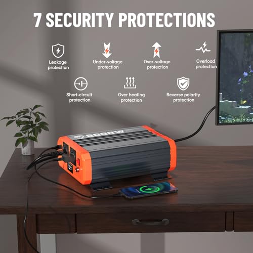 Der Wechselrichter verfügt über sechs Schutzfunktionen, darunter Schutz vor Überspannung, Unterspannung, Überlast, Kurzschluss, Überhitzung, Erdungsleckage und automatischem Neustart. Dank dieser Sicherheitsvorkehrungen kannst du den Wechselrichter sicher an verschiedene Batterietypen und Elektrogeräte unter 2000W anschließen, wie Laptops, Mikrowellen, Gefrierschränke, Klimaanlagen, Projektoren und Kameras. Die Installation ist einfach: Du musst lediglich die Batterie mit dem beigefügten Kabel an den Wechselrichter anschließen.