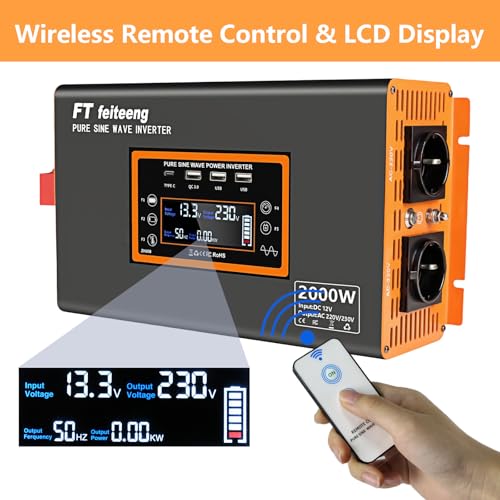Fragen und Antworten zu 2000W Reiner Sinus-Wellenleistungsinverter, 12V DC bis 220V/230V AC-Konverter mit LCD-Display, USB-C-Anschluss und QC 3.0-Hafen für Camping-Notfallfahrzeuge Truck RV