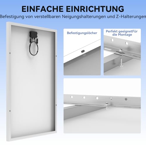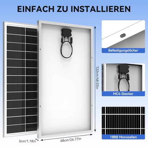 Das Solarpanel ist ideal für den netzunabhängigen Einsatz geeignet und kann an 12V, 18V, 24V oder 48V Systeme angeschlossen werden. Es ist perfekt für Wohnmobile, Wohnwagen, Boote, Gartenhäuser und andere Anwendungen, bei denen eine zuverlässige Stromversorgung benötigt wird. Die Solarmodule der Klasse A+ sind dicht angeordnet, um Platz zu sparen und die aufnahmefläche der Zellen zu vergrößern.