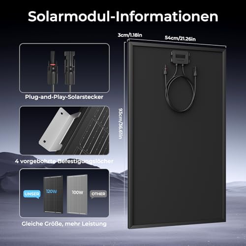 - Das Set enthält monokristalline Solarpanels, einen Solarregler, Z-Befestigungsklammern, Solarkabel und Verbindungskabel.