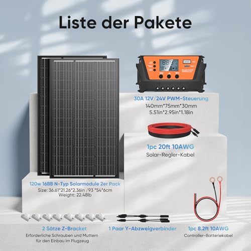 Produktbeschreibung: 240w Solarpanel Solarzelle kit: 12V Solarmodul + 30 A Solarladeregler, Solarkabel, 2 Stücke 120W Mono Solarmodul für 12V Batterien Solaranlage, Wohnmobil, Wohnwagen