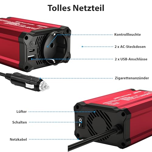 Mit diesem Auto-Wechselrichter bist du unterwegs bestens versorgt. Du kannst deine elektronischen Geräte wie Laptops, Tablets oder Smartphones aufladen, ohne auf Raststätten oder Hotelzimmer angewiesen zu sein. Das ist besonders praktisch auf längeren Fahrten, im Urlaub oder auf Geschäftsreisen. Der Wechselrichter bietet dir die Flexibilität, deine Geräte jederzeit und überall einsatzbereit zu halten. Laut Produktbeschreibung können bis zu vier Geräte gleichzeitig mit Strom versorgt werden.
