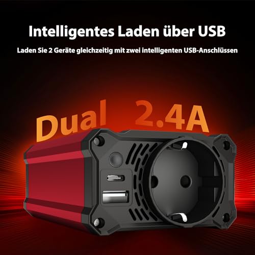 Fragen und Antworten zu 300W Auto Wechselrichter, DC 12 V auf 230 V Auto-Wechselrichter mit AC Steckdosen und 3.4 A Dual-USB-Anschlüssen, Autostecker Adapter Steckdosenkonverter