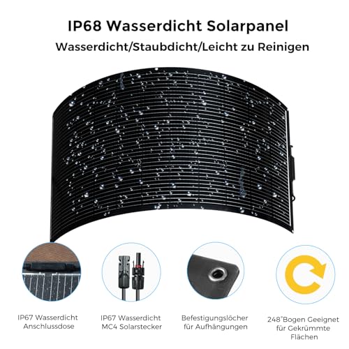 Im Vergleich zu starren Solarmodulen bietet dieses flexible Solarpanel Kit den Vorteil einer einfacheren Installation auf unebenen Flächen. Andere Komplettsets enthalten möglicherweise keine flexiblen Module oder bieten eine geringere Leistung. Die hohe Effizienz der monokristallinen Zellen sorgt für eine gute Stromausbeute, während der mitgelieferte Laderegler die Batterie schützt.