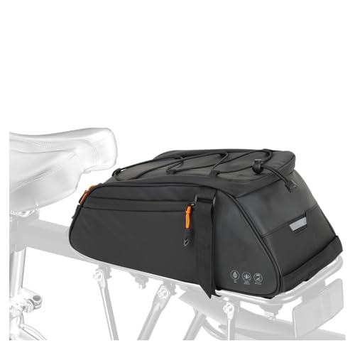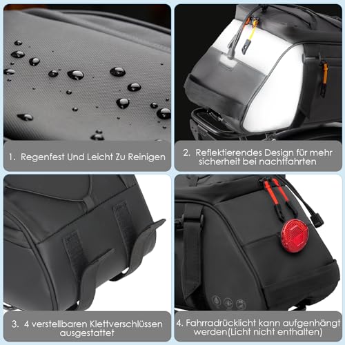 Fragen und Antworten zu 4 in1 Fahrrad Gepäckträgertasche, 10L Wasserdicht Reflektierend Bike Saddle Bag Multifunktionale Bike Rear Rack Bag mit Shoulder Strap Rucksackfunktion für Radfahren Pendeln Camping (Schwarz)