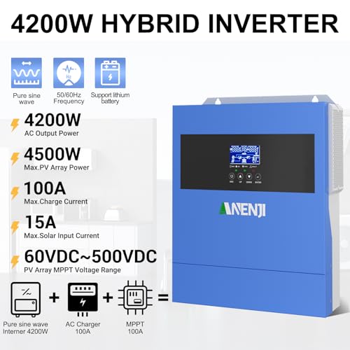 Produktbeschreibung: 4200W Solar Hybrid Wechselrichter 24Vdc zu 230Vac Reiner Sinus Wechselrichter mit 100A MPPT Solarladeregler, Max PV-Eingangsspannung 500V, für 24V Lithium Batterien,mit WiFi-Modul