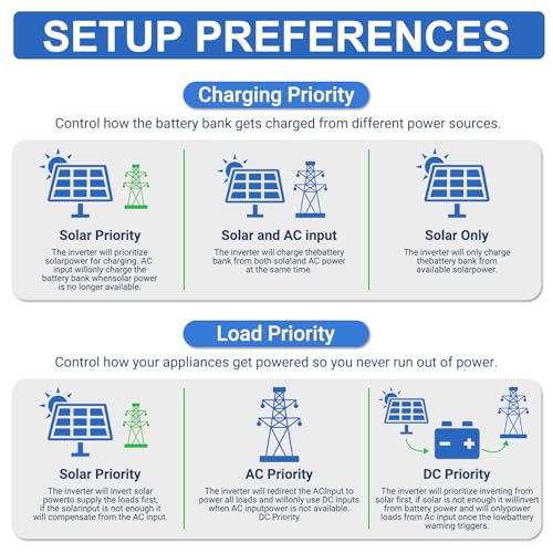 Ein besonderes Merkmal dieses Wechselrichters ist seine Flexibilität. Du kannst ihn sowohl mit als auch ohne Batterie betreiben. Im batterielosen Betrieb versorgt der Wechselrichter die Last direkt aus dem Photovoltaik-Array oder der Wechselstromquelle. Beachte aber, dass im batterielosen Betrieb eine Photovoltaikspannung von mindestens 130 Vdc erforderlich ist. Darüber hinaus ist der Wechselrichter mit verschiedenen Ausgangsmodi ausgestattet, sodass du die Stromversorgung optimal an deine Bedürfnisse anpassen kannst. Wähle zwischen Netzpriorität (UTL), Solarenergiepriorität (SOL), Batteriepriorität (SBU), Solarenergie-Batterie-Priorität (SUB) oder sogar der Möglichkeit, überschüssige Energie ins Netz zurückzuspeisen (SUF).