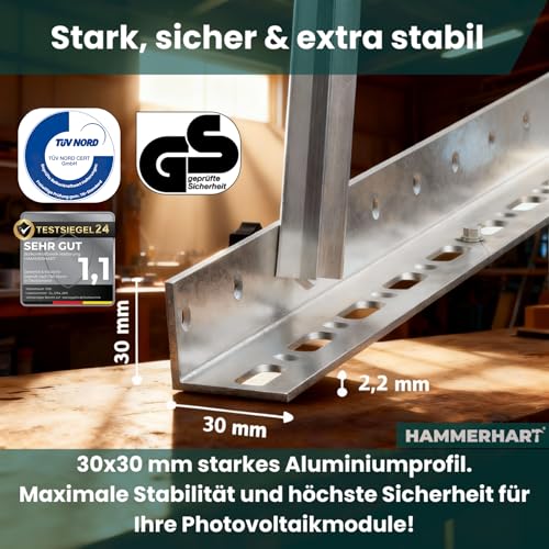 Ein besonderes Merkmal ist der einstellbare Neigungswinkel von 0 bis 90 Grad. Dadurch kannst du deine Solarpanele optimal zur Sonne ausrichten und so die maximale Stromausbeute erzielen. Die Halterung ist TÜV geprüft und zertifiziert, was dir zusätzliche Sicherheit gibt. Dank der Materialstärke von 2.5mm zeichnet sich die Halterung durch eine hohe Belastbarkeit aus und ist für einen langfristigen und rostfreien Einsatz konzipiert.