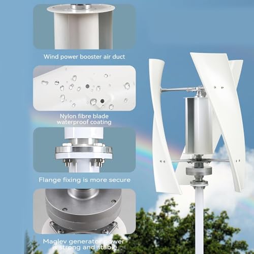 Mit dem 5000W Windkraftanlage Generator Kit erhältst du eine kompakte und leistungsstarke Lösung zur Nutzung von Windenergie. Dieses Kit enthält einen vertikalen Windkraftgenerator, der sich durch seine besondere Bauweise auszeichnet. Im Vergleich zu horizontalen Windturbinen ist er deutlich leiser und eignet sich daher gut für den Einsatz in Wohngebieten oder als dekoratives Element. Die Rotorblätter bestehen aus verstärkten Nylonfasern, die für Stabilität und hohe Windbeständigkeit sorgen.