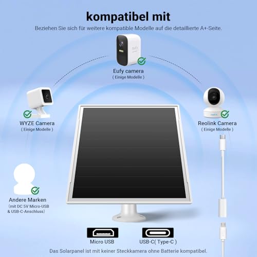 Dieses 8W Solarpanel wurde speziell für die Stromversorgung von Überwachungskameras im Außenbereich entwickelt. Es ist mit einem 5-Volt-Solarladegerät ausgestattet und verfügt über sowohl einen Micro-USB- als auch einen USB-C-Anschluss, was es mit einer Vielzahl von Kameras kompatibel macht. Laut Produktbeschreibung ist es mit Modellen von Eufy, Wyze und Reolink kompatibel, sofern diese über die genannten Anschlüsse verfügen. Bitte beachte, dass das Solarmodul nicht mit Kameras kompatibel ist, die andere Anschlüsse nutzen.