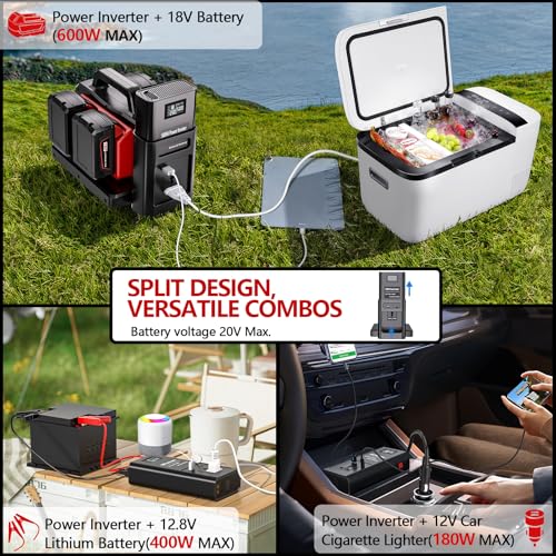 Dieser Wechselrichter ist nicht nur ein Spannungswandler, sondern auch eine All-in-One-Ladezentrale. Er verfügt über einen USB-A-Anschluss (5V/2,1A), einen 18W PD USB-C-Anschluss, eine 12V Autobuchse und Wechselstromsteckdosen. Damit kannst du gleichzeitig Smartphones, Laptops, Autokühler und Werkzeuge aufladen. Das getrennte Design ermöglicht es dir, das Gerät auch separat als Batterielader oder Autowerkzeugerzeuger (max. 180W) zu verwenden.