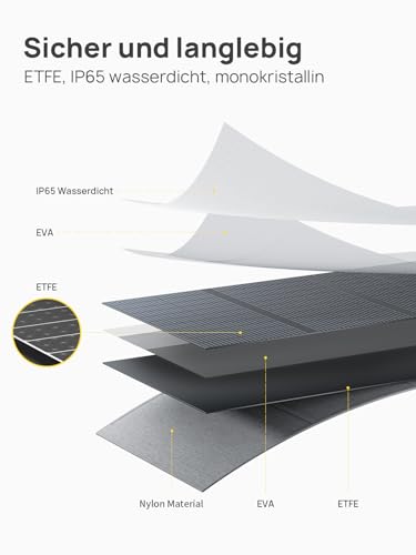Ein besonderes Merkmal dieses Solarmoduls ist seine Portabilität. Dank des faltbaren Designs lässt es sich leicht transportieren und verstauen. Im zusammengeklappten Zustand misst es nur 48,2 x 82 x 6,4 cm und wiegt lediglich 9,8 kg. Ausgeklappt bietet es eine großzügige Solarfläche von 280 x 82 x 0,4cm, um die Sonnenenergie effizient zu nutzen. Das robuste ETFE-Material sorgt für eine außergewöhnliche Haltbarkeit und Widerstandsfähigkeit gegenüber UV-Strahlen, extremen Temperaturen und verschiedenen Wetterbedingungen. Mit seiner IP65-Einstufung ist das Solarmodul zudem vor Staub und Spritzwasser geschützt.