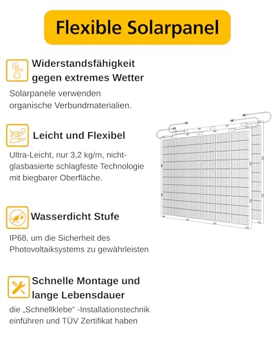 Die flexiblen Solarpaneele sind nicht nur leicht und anpassungsfähig, sondern auch langlebig und widerstandsfähig. Dank der wasserdichten IP68-Technologie können sie in einem Temperaturbereich von -20°C bis 65°C betrieben werden, sodass du das ganze Jahr über Strom erzeugen kannst. Die Größe der Solarpaneele beträgt 1009x1159x3 mm, was sie für den Einsatz in engen oder unregelmäßigen Umgebungen geeignet macht. Die Installation ist denkbar einfach und kann von einer Person in etwa 30 Minuten ohne spezielles Werkzeug durchgeführt werden.