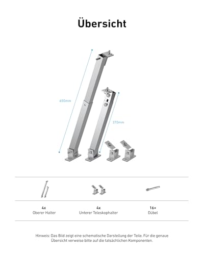 Im Lieferumfang erhältst du ein Doppelpanel-Set mit 4 Halterungen, das für 2 PV-Panels ausgelegt ist. Mit diesem Set bist du bestens ausgestattet, um dein Balkonkraftwerk sicher und effizient an der Wand zu montieren und von maximaler Energiegewinnung zu profitieren. Investiere in eine hochwertige und langlebige Lösung für dein Balkonkraftwerk.
