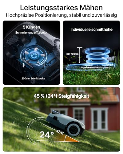 Die Installation gestaltet sich denkbar einfach: Der Rasenroboter erstellt die Karte deines Gartens automatisch oder du steuerst ihn manuell per Fernbedienung. Dank der KI-gestützten Objekterkennung und 360° Kollisionssensoren werden auch Tiere und andere Hindernisse frühzeitig erkannt. Das leistungsstarke Schneidsystem mit 5-fach Edelstahlmesser sorgt für ein gleichmäßiges Schnittbild, auch an Rasenkanten und in schwierigem Gelände mit Steigungen bis zu 45 %.