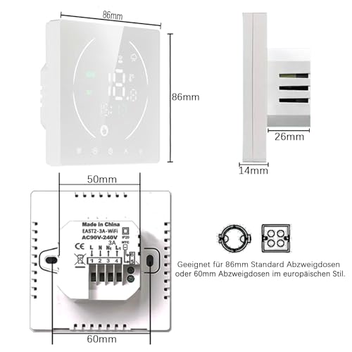 Der Arpokcoe Thermostat ist speziell für Wasser-Fußbodenheizungen entwickelt und bietet dir eine komfortable und intelligente Steuerung deiner Heizung. Bitte beachte, dass dieser Thermostat nicht für elektrische Heizsysteme geeignet ist. Überprüfe daher vor dem Kauf deinen Heizungstyp. Dank der Kompatibilität mit 86mm Standard-Anschlussdosen oder 60mm europäischen Anschlussdosen lässt sich der Thermostat einfach installieren. Der Spannungsbereich liegt bei 90V-240V.