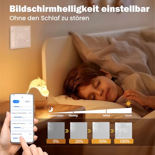 - Ja, die Helligkeit des Thermostatbildschirms kann prozentual eingestellt oder ganz ausgeschaltet werden.