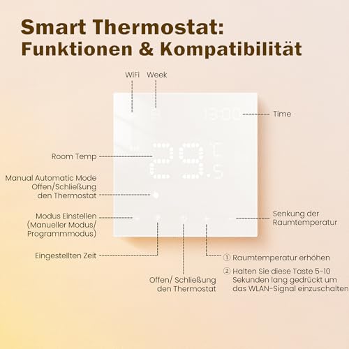 Der AVATTO Thermostat ist ein smarter Raumthermostat, der speziell für die Steuerung von Wasser-Fußbodenheizungen und Gasboilern entwickelt wurde. Er ermöglicht dir, die Raumtemperatur präzise zu regulieren und so ein angenehmes Wohnklima zu schaffen. Die Besonderheit dieses Thermostats liegt in seiner WiFi-Fähigkeit. Dank dieser Funktion kannst du den Thermostat bequem per Smart Life App von überall aus steuern.