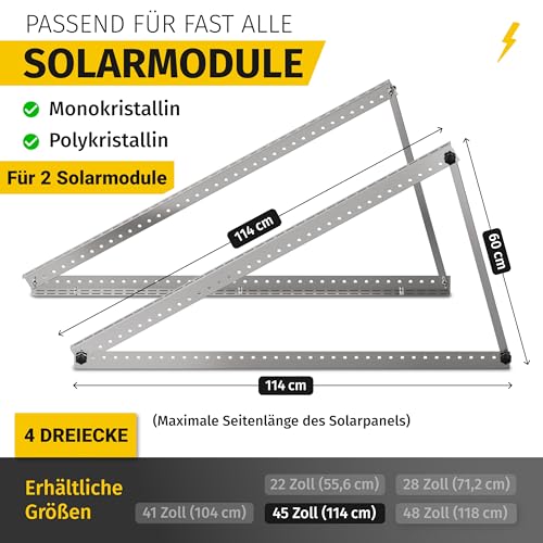 Um sicherzustellen, dass die Halterung die richtige Größe für deine Solarmodule hat, solltest du vor dem Kauf die Länge der Aufständerung mit der Seite deines Panels vergleichen. Die Halterung ist für Module mit einer Seitenlänge von maximal 114 cm geeignet. Im Lieferumfang sind 2 x 2 Montagedreiecke, Schrauben und eine detaillierte Montageanleitung auf Deutsch enthalten. Du benötigst ein Paar Halterungen, um ein Solarpanel zu installieren.