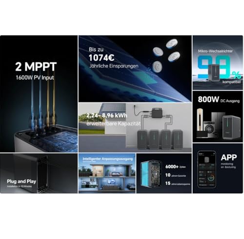 Ein besonderes Merkmal ist die effiziente Stromspeicherung. Die Speicher sind DC-betrieben, was bedeutet, dass weniger Verluste als bei AC-Speichern entstehen. So kannst du den erzeugten Strom auch in den Abendstunden optimal nutzen. Mit dem Smart Meter kannst du sogar eine Nulleinspeisung einrichten, um den Eigenverbrauch zu maximieren. Der Wechselrichter ist laut deutscher Gesetzgebung auf maximal 800W Einspeisung ins Hausnetz ausgelegt.