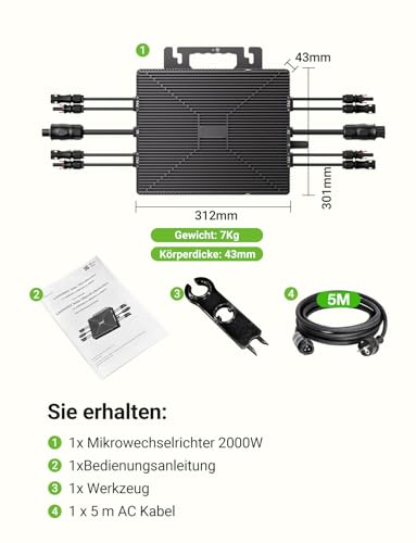 - Im Lieferumfang sind ein 2000W Mikrowechselrichter, ein 5 m AC-Anschlusskabel, eine Bedienungsanleitung und Werkzeug enthalten.