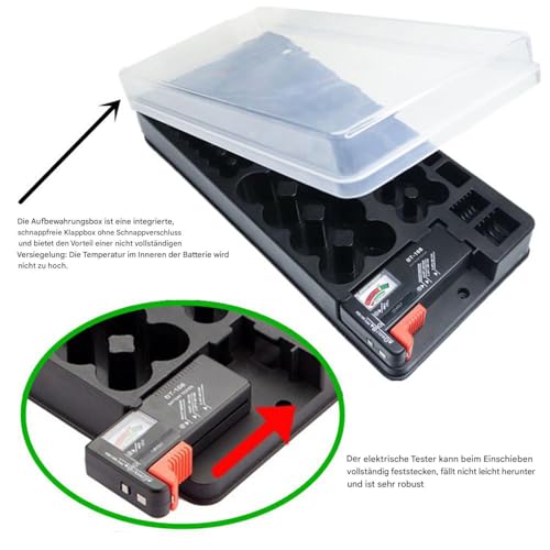 - Bietet Platz für eine große Anzahl von Batterien verschiedener Größen.