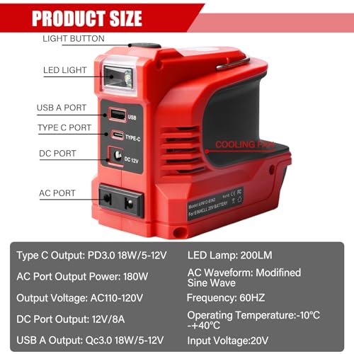 Produktbeschreibung: Behogan 220W Akku Wechselrichter für Einhell 18V Akku DC 18V auf AC 220V tragbares Netzteil Spannungswandler Adapter mit USB Type-C Anschluss DC12V und LED Lampe