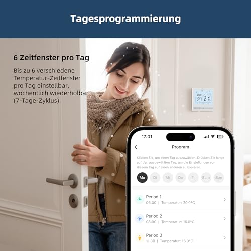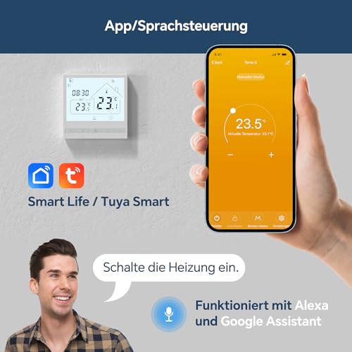 Ein besonderes Feature ist die Möglichkeit der täglichen Programmierung. Du kannst bis zu 6 Heizperioden pro Tag individuell konfigurieren und so die Heizung optimal an deinen Tagesablauf anpassen. Das spart Energie, da die Heizung nur dann läuft, wenn du sie wirklich brauchst. Außerdem ist der Thermostat mit Google Home und Alexa kompatibel. Mit einfachen Sprachbefehlen kannst du die Temperatur ändern oder das Gerät ein- und ausschalten.