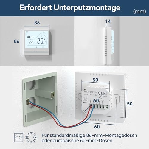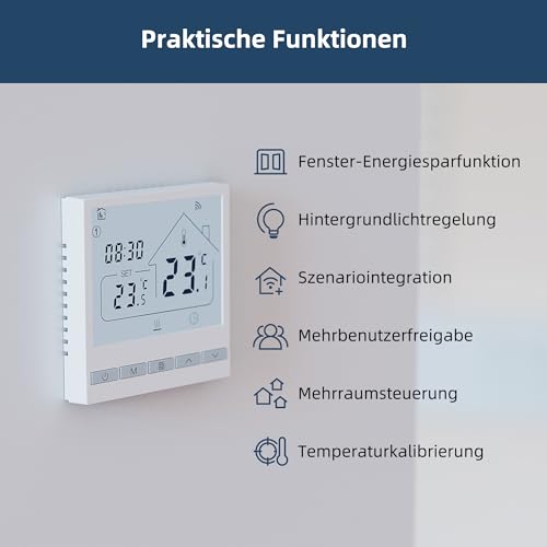 Neben den intelligenten Funktionen bietet der Thermostat auch eine Reihe weiterer nützlicher Features. Dazu gehören eine Fenstererkennung, eine einstellbare Helligkeit des großen LCD-Bildschirms, eine integrierte Kindersicherung, ein Frostschutz, ein Abschalt-Speicher, eine Temperaturkalibrierung, ein Hochtemperaturschutz und eine Starttemperaturdifferenz. Der Thermostat ist für die Unterputzmontage vorgesehen und hat eine Abmessung von 8,5 x 8,5 x 4,2 cm.