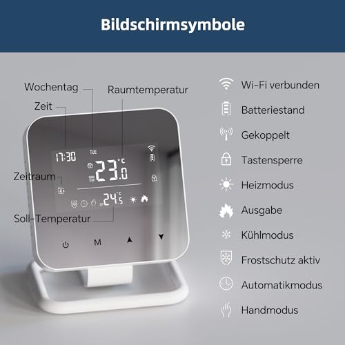 Ein besonderes Merkmal des Beok Thermostats ist die WiFi-Funktion, die es dir ermöglicht, dein Heizsystem von überall aus zu steuern. Mit der „tuya“ oder „smart life“ Smartphone-App kannst du die Temperatur anpassen und Heizpläne verwalten. Zusätzlich unterstützt das Thermostat die Sprachsteuerung über Alexa oder Google Assistant, was dir noch mehr Komfort bietet. Das Thermostat bietet auch eine tägliche Programmierung, mit der du bis zu 6 verschiedene Temperaturen pro Tag festlegen kannst, um deinen individuellen Bedürfnissen und Gewohnheiten gerecht zu werden. Weitere nützliche Funktionen sind Kühlung und Heizung, eine Kindersicherung, Abschaltspeicher, Frostschutz, Temperaturkompensation, Temperaturhysterese und die Möglichkeit, die Werkseinstellungen wiederherzustellen.