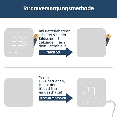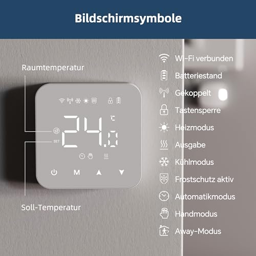 - Da das Thermostat auch RF Wireless unterstützt, ist eine Bedienung ohne Smartphone möglich.