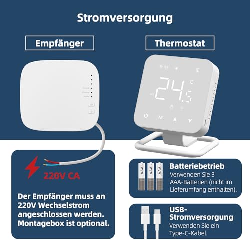 - Drahtlose Kommunikation zwischen Thermostat und Empfänger für flexible Installation.
