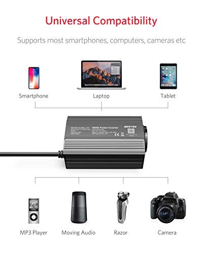Produktbeschreibung: BESTEK 300W Wechselrichter/Spannungswandler 12v 230v /Stromwandler Inverter 12v auf 230v /mit Zertifiziert und Dual USB 4,8 A inkl. Kfz Zigarettenanzünder Stecker, Schwarz