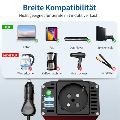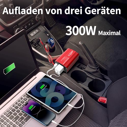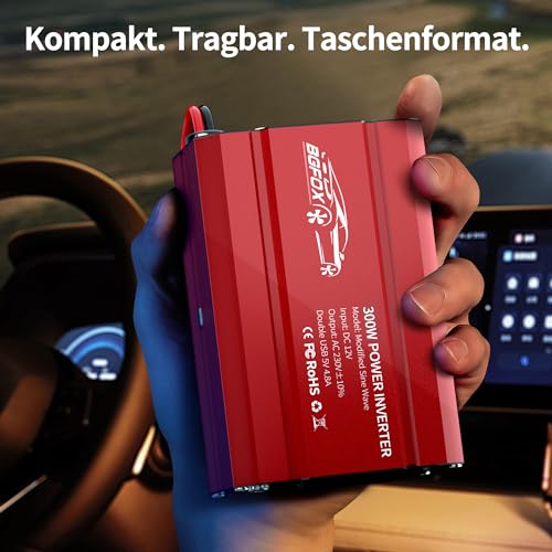 Fragen und Antworten zu BGFOX 300W Spannungswandler DC 12V auf 230V AC Wechselrichter Modifizierte Sinus Stromumwandler mit 4.8A-Dual-USB-Anschluss, Laden Sie Ihr Laptop,für iPhone, iPad, Tablet Und Mehr – Rot