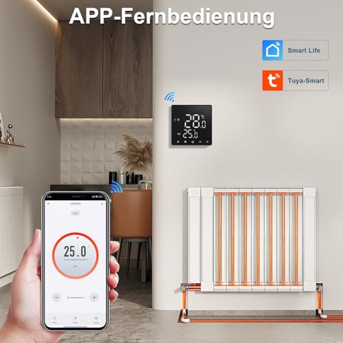 Ein besonderes Merkmal ist die WLAN-Funktion. Damit kannst Du das Thermostat bequem über die Smart Life App steuern, egal wo Du gerade bist. Ob von der Arbeit aus oder vom Sofa – Du hast jederzeit die Kontrolle über Deine Heizung. Die Kompatibilität mit Google Home und Alexa ermöglicht zusätzlich eine bequeme Sprachsteuerung.
