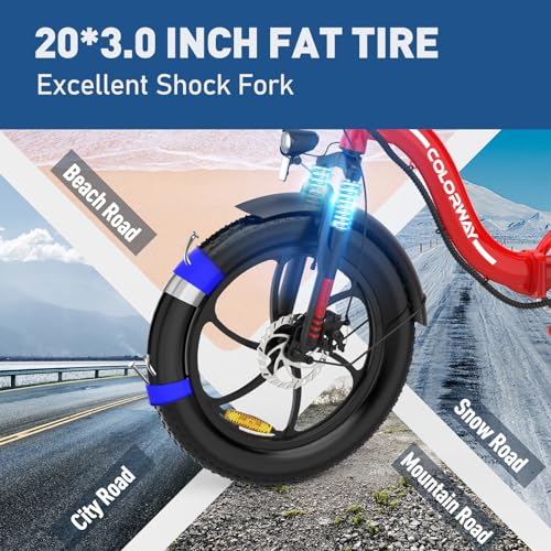 Die 20×3,0-Zoll-Fettreifen des COLORWAY E-Bikes bieten nicht nur eine hervorragende Straßenlage, sondern absorbieren auch Stöße und Vibrationen, was den Fahrkomfort zusätzlich erhöht. Der stoßdämpfende Sitz und die vordere Federgabel tragen ebenfalls zu einem angenehmen Fahrerlebnis bei. Mit diesem E-Bike bist du nicht nur umweltfreundlich unterwegs, sondern auch komfortabel und sicher.