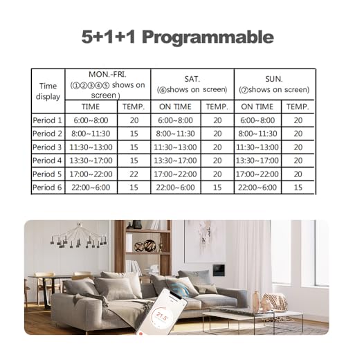 Ein besonderes Merkmal des Decdeal Thermostats ist die wöchentliche programmierbare Funktion. Du kannst bis zu sechs verschiedene Zeitintervalle pro Tag einstellen und so deine Heizung optimal an deinen Tagesablauf anpassen. Dies trägt nicht nur zur Energieeffizienz bei, sondern erhöht auch den Komfort und hilft der Umwelt. Zusätzlich zur Programmierung bietet der Thermostat einen manuellen Modus, in dem du die Temperatur individuell einstellen kannst. Die einstellbaren Lichtfarben in Violett, Blau, Grün, Rot, Orange, Gelb und Himmelblau sorgen für eine angenehme Atmosphäre. Der Thermostat ist auch mit einer Kindersicherungsfunktion ausgestattet und bietet Schutz bei Stromausfall, um deine Einstellungen zu sichern. Er informiert dich über das Wetter und die Luftfeuchtigkeit.
