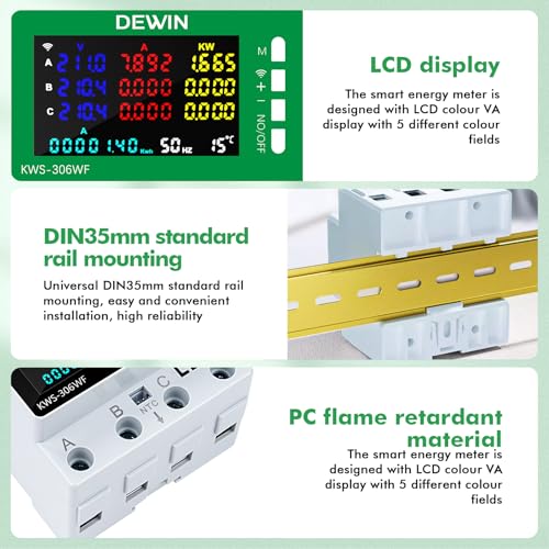 Produktbeschreibung: DEWIN Stromzähler 3 Phasen Wlan, KWS-306WF Tuya WiFi Stromzähler 3 Phasig 4 Leiter Voltmeter und Amperemeter Energiezähler Hutschiene mit APP-Fernbedienung 80A AC 230V/400V