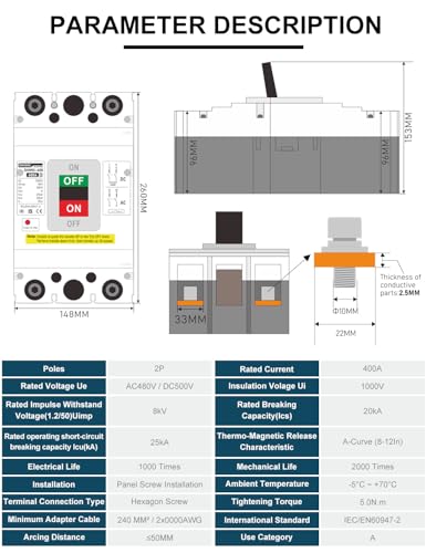 Für eine optimale und sichere Verwendung, besonders in 48V-Mischwechselrichtern für Heimenergiespeicheranlagen, wird empfohlen, den Leistungsschalter auf den 1,5-fachen Arbeitsstrom zu wählen. Zubehör wie Kabelanschlüsse, ein Sechskantschlüssel und Montageschrauben sind im Lieferumfang enthalten, um dir die Installation zu erleichtern. Beachte, dass bei Anwendungen mit hohem Strom Kabelanschlüsse verwendet werden sollten, um Schäden durch unzureichenden Kontakt zu vermeiden.