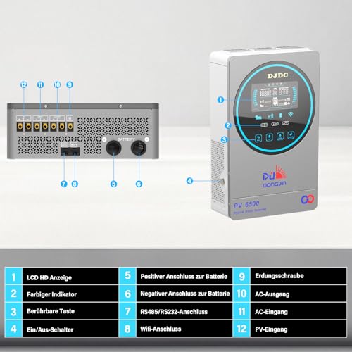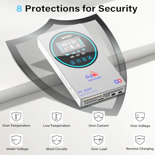 Im Vergleich zu anderen Hybrid-Wechselrichtern zeichnet sich der DJDCPOWER 4500W durch seinen integrierten 150A MPPT-Solarladeregler und die reine Sinuswellenausgabe aus. Während einige Modelle möglicherweise nur Blei- oder Lithiumbatterien unterstützen, ist dieser Wechselrichter für beide Batterietypen geeignet. Das Touchdisplay ermöglicht eine benutzerfreundliche Konfiguration und Überwachung, was bei manchen einfacheren Geräten fehlt. Die maximale PV-Eingangsleistung und der breite Spannungsbereich bieten Flexibilität bei der Auswahl der Solarmodule.
