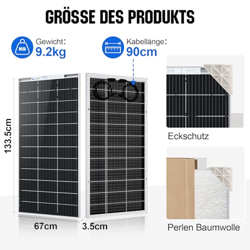 Laut Produktbeschreibung ist das Solarmodul mit einer wasserdichten IP65-Anschlussdose ausgestattet und widersteht starken Winden und Schneelasten. Der langlebige Aluminiumrahmen sorgt für Stabilität und eine lange Lebensdauer, auch bei rauem Wetter. Die Installation wird durch vorgebohrte Löcher auf der Rückseite der Platte erleichtert.