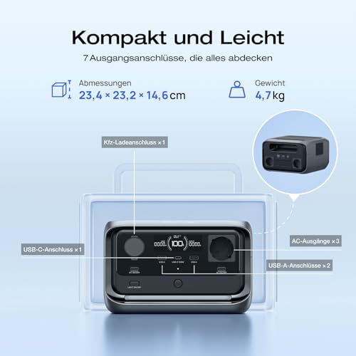 Die RIVER 3 Plus ist zudem auf Langlebigkeit ausgelegt. Die LiFePO4-Batterie hat eine Lebensdauer von bis zu 3 000 Zyklen, was einer täglichen Nutzung über 10 Jahre entspricht. Das kompakte und leichte Design macht den Transport einfach, sodass du die Powerstation problemlos überallhin mitnehmen kannst. Mit der integrierten Beleuchtung hast du auch bei Dunkelheit immer den Durchblick. Das flüsterleise Betriebsgeräusch von 30 dB sorgt dafür, dass du nicht gestört wirst.