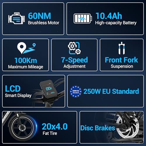 Fragen und Antworten zu ECORUSH ECO R2 E Bike Klapprad, E-Bike mit 20×4,0 Zoll Fat Tire, Hochfester Körper, 48V 499.2Wh Akku, 7-Gang, LCD-Display, 250W Motor & 25Km/h Elektrofahrräder für Herren und Damen