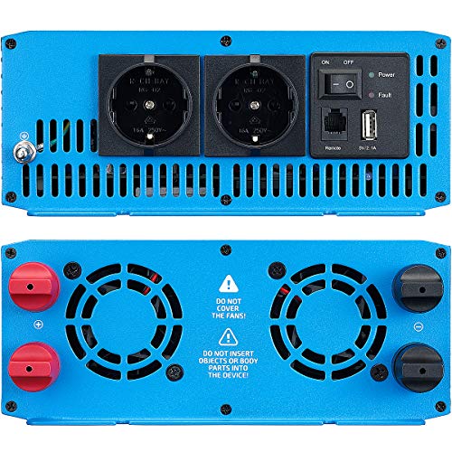 Neben seiner Vielseitigkeit überzeugt der Wechselrichter auch durch seine Leistung. Er liefert eine Dauerleistung von 2500W, kann aber kurzzeitig auch höhere Leistungen abgeben, um auch Geräte mit hohen Anlaufströmen problemlos zu betreiben. Für eine hohe Sicherheit sorgen integrierte Schutzfunktionen wie Softstart, Über-/Unterspannungsschutz und Überlastschutz. Das stabile, gerippte und pulverbeschichtete Aluminiumgehäuse gewährleistet dabei eine maximale Passivkühlung, was die Lebensdauer des Geräts verlängert.