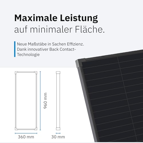 Dank der rückseitig kontaktierten monokristallinen Solarzellen wird die gesamte Zellfläche optimal genutzt, was zu einem Wirkungsgrad von 24,7% führt. Dies bedeutet, dass du mehr Strom aus einer kleineren Fläche gewinnen kannst. Zudem sind die Zellen temperaturresistent und leistungsstärker als herkömmliche Module. Das Modul ist auch bei Teilverschattung leistungsfähig, was es zu einer idealen Wahl für den Einsatz im Freien macht.
