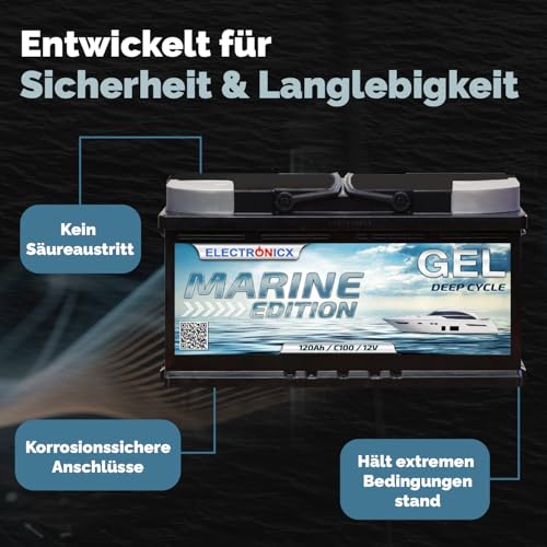 Fragen und Antworten zu Electronicx GEL Marine Versorgungsbatterie 12V 120Ah / 120 Ah 12 Volt – Deep Cycle Batterie wartungsfrei & versiegelt – 353×175×190 mm – Boot Yacht Segelboot Solar Wohnmobil Freizeit Stromspeicher GEL