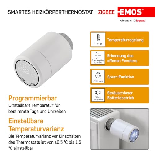 Produktbeschreibung: EMOS GoSmart Heizkörperthermostat mit App, programmierbarer ZigBee Smart Home Thermostat, einstellbare Hysterese, kompatibel mit Tuya, Smart Life, Alexa, Google Assistant