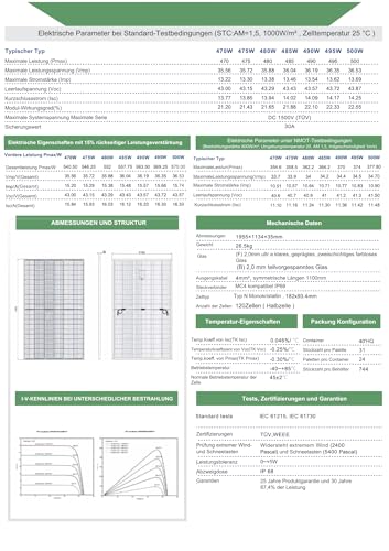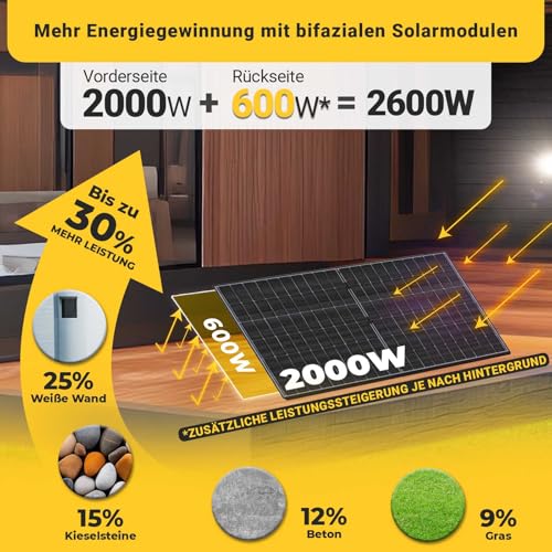 - Die erzeugte Strommenge hängt von der Sonneneinstrahlung und dem Standort ab. Unter idealen Bedingungen können die Solarmodule bis zu 2000W erzeugen.